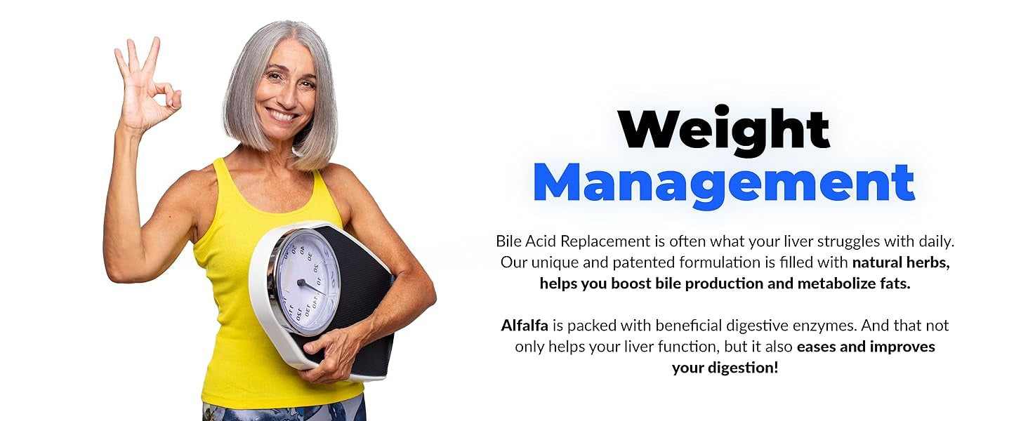 • Bile Acid Replacement is often what your liver struggles with daily. Our unique and patented formulation is filled with natural herbs, helps you boost bile production and metabolize fats. Alfalfa is packed with beneficial digestive enzymes. And that not only helps your liver function, but it also eases and improves your digestion!